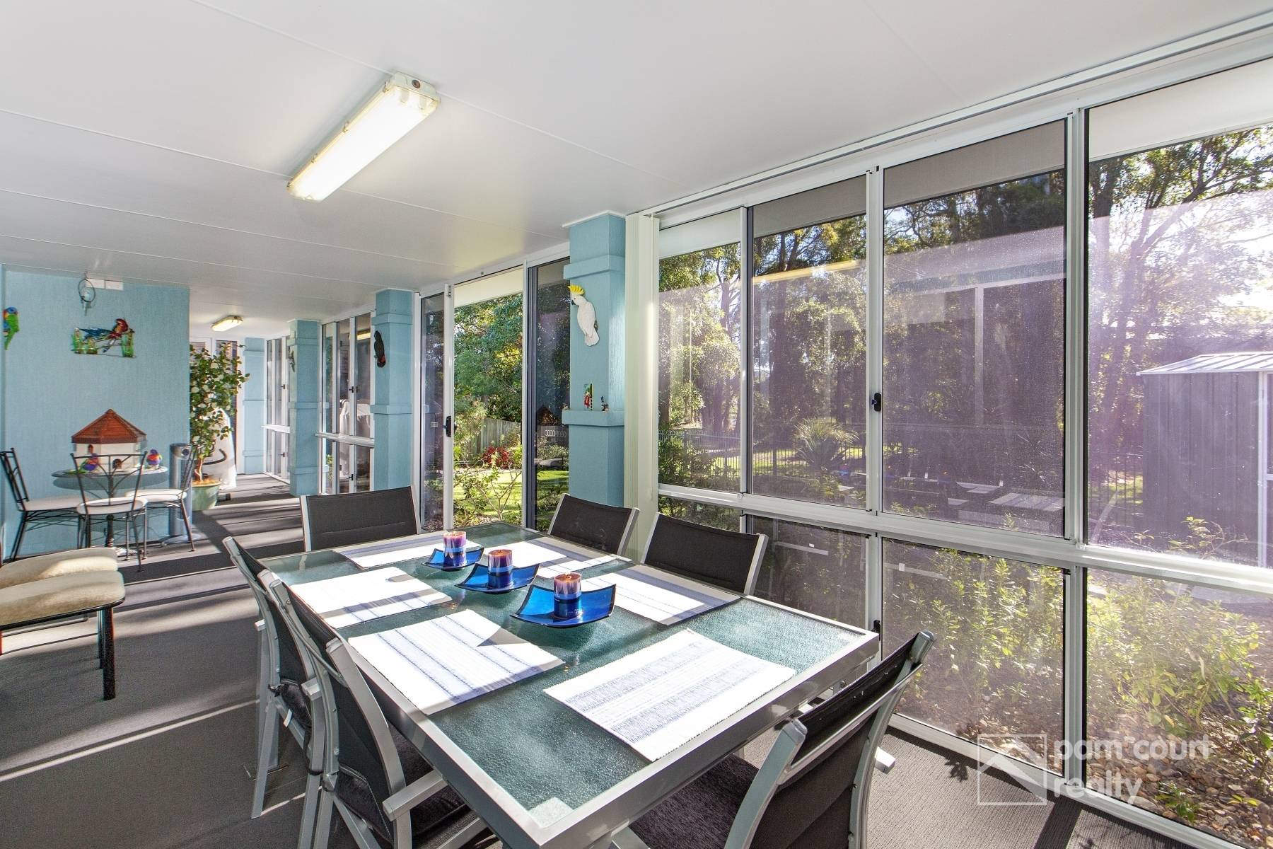 • Enclosed sunroom with glass sliding doors and windows to let in the cool breezes