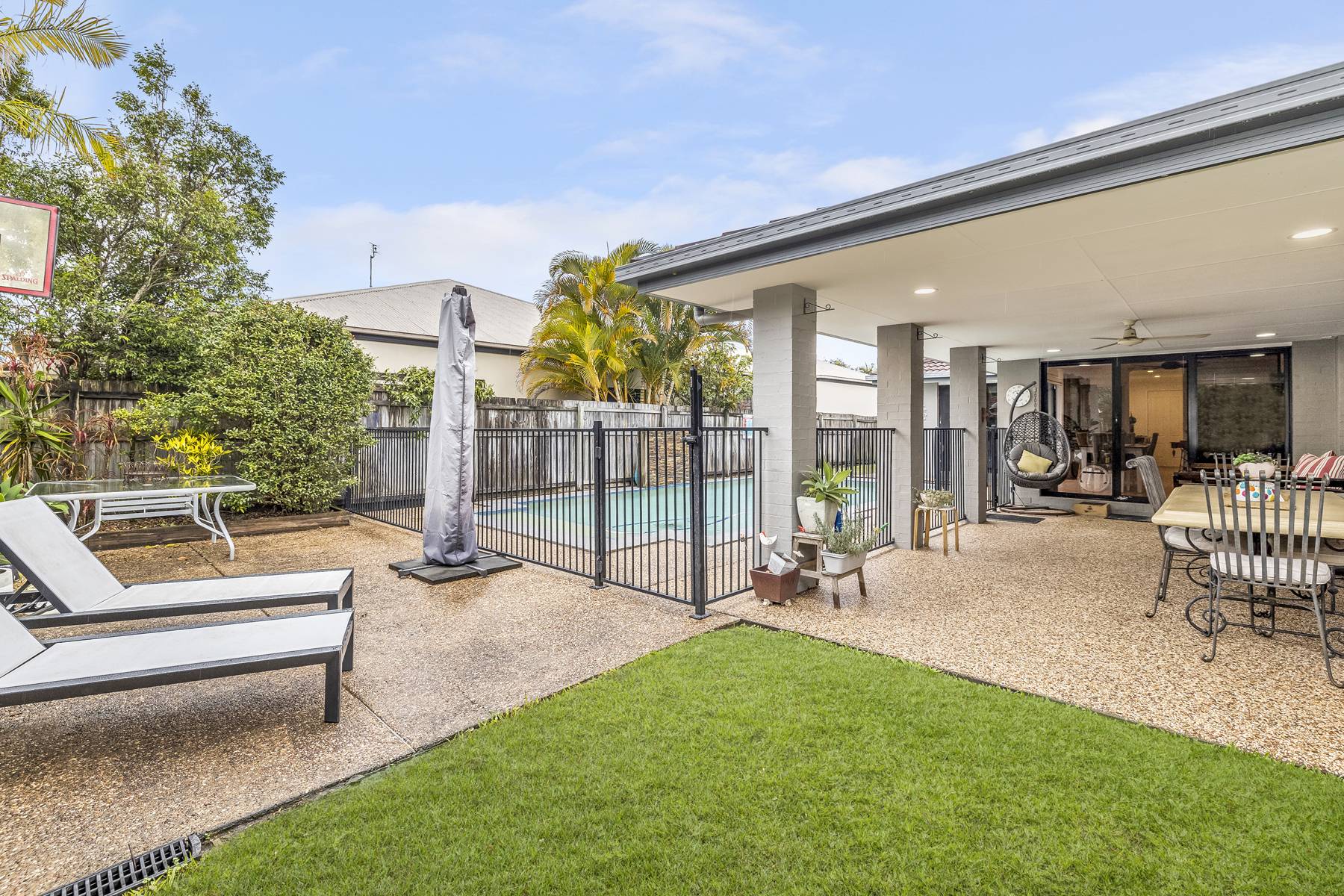Outside sit alongside the sparkling in-ground pool, complete with water feature and adjacent to the undercover outdoor entertaining area.