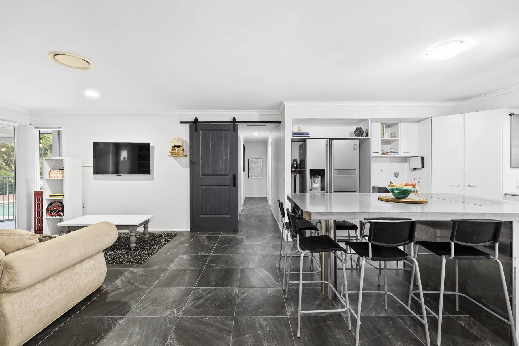 •    Open plan kitchen with pressed stainless steel island bench, dishwasher, plumbed double fridge space and ample storage